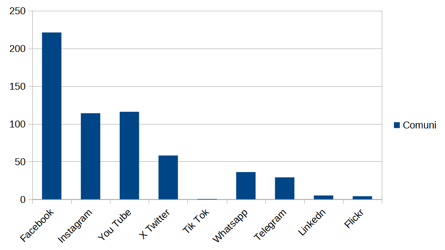 Dalla rilevazione è emerso che il canale più utilizzato dai Comuni è Facebook, attivato da parte di 221 Comuni. Instagram e You Tube vengono usati rispettivamente da 114 e 116 Comuni, mentre il terzo Social più diffuso risulta X (ex Twitter) presente per 58 enti.